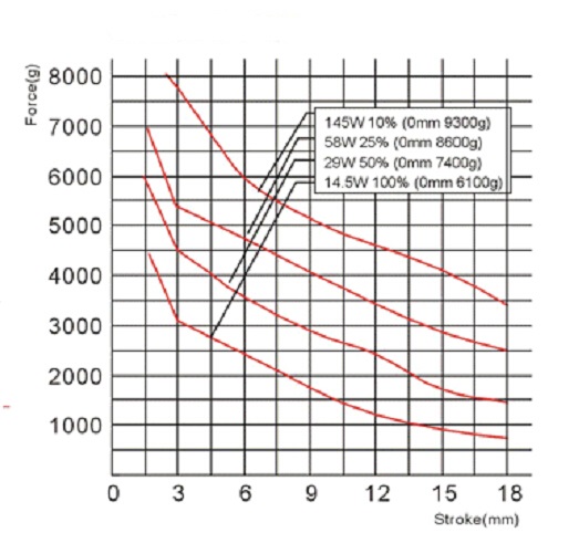 二、大行程電磁鐵部分行程和力量的曲線圖: